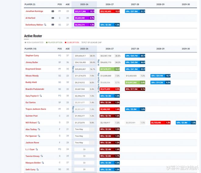 NBA歷史上還沒(méi)有以4位35歲以上球星為核心奪冠的先例。勇士在續(xù)約庫(kù)明加時(shí)做了薪金上的讓步,造成的一大后果就是,球隊(duì)現(xiàn)在沒(méi)法直接給小庫(kù)里一份底薪合同。勇士續(xù)約庫(kù)明加之后,僅剩200萬(wàn)美元的空間,無(wú)法用老將底薪(229.6萬(wàn)美元)簽人。