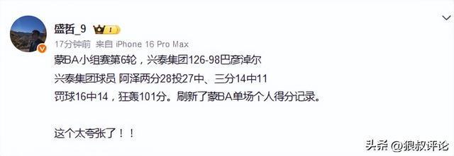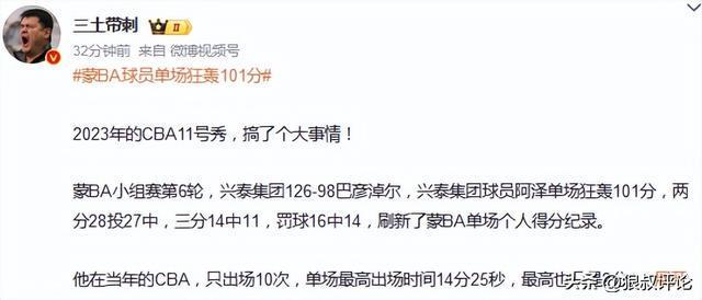 北京時(shí)間10月21日,BA小組賽第6輪,興泰集團(tuán)126-98巴彥淖爾,前CBA球員阿澤單場(chǎng)狂轟101分,兩分28投27中,三分14中11,刷新了蒙BA單場(chǎng)個(gè)人得分紀(jì)錄。