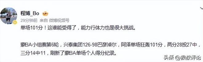 媒體人程博社媒發(fā)文點(diǎn)評(píng)阿澤單場(chǎng)101分:即使能力行體力也是很大挑戰(zhàn)。