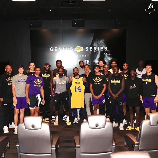 第二天,湖人在官方社交賬號(hào)上發(fā)布了分享會(huì)的照片。威爾·史密斯站在湖人球員、教練和佩林卡中間,手舉著一件特別定制的球衣,詹姆斯在身旁笑臉相迎,而在他們右側(cè)不遠(yuǎn)處,威少站在那里,面無(wú)表情,甚至可以說(shuō)有些憤怒。