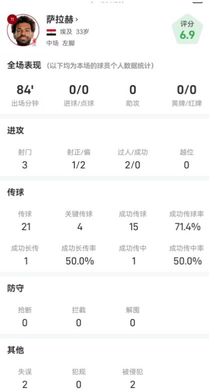 薩拉赫還有著21次傳球,15次傳球成功,其中包括4次關(guān)鍵傳球,他在場上的傳球成功率為71.4%。薩拉赫還有著1次長傳,長傳成功率為50%;薩拉赫有著1次成功傳中,成功為50%。