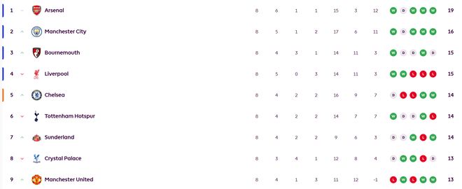 雷速體育10月20日訊 英超雙紅會(huì)焦點(diǎn)戰(zhàn),曼聯(lián)在安菲爾德客場(chǎng)2-1擊敗利物浦,馬奎爾貢獻(xiàn)頭球絕殺。英超最新積分榜方面,阿森納8輪6勝1平1分以19分領(lǐng)跑,曼城16分第二落后槍手3分。利物浦各項(xiàng)賽事遭遇四連敗,其中英超三連敗,已經(jīng)從榜首跌至第四。伯恩茅斯和紅軍同積15分,排在第3。曼聯(lián)全取三分后攀升至第9的位置。