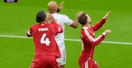 然而,這也是一個存在巨大爭議的進(jìn)球。關(guān)鍵在于,在爭搶頭球時,范戴克不慎肘擊麥克阿利斯特,導(dǎo)致后者頭部受傷后倒地??吹禁溈税⒗固厥軅沟?,范戴克反應(yīng)稍慢,讓姆貝莫得到了在小禁區(qū)起腳射門的機(jī)會。