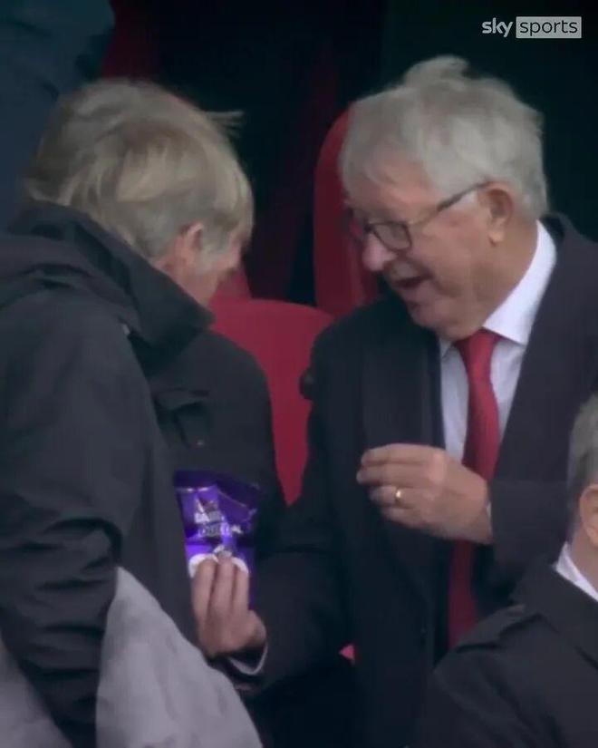 曼聯(lián)一球領(lǐng)先結(jié)束上半場(chǎng),弗爵在看臺(tái)上也頗為輕松,與利物浦名宿達(dá)格利什分享了自己的巧克力。